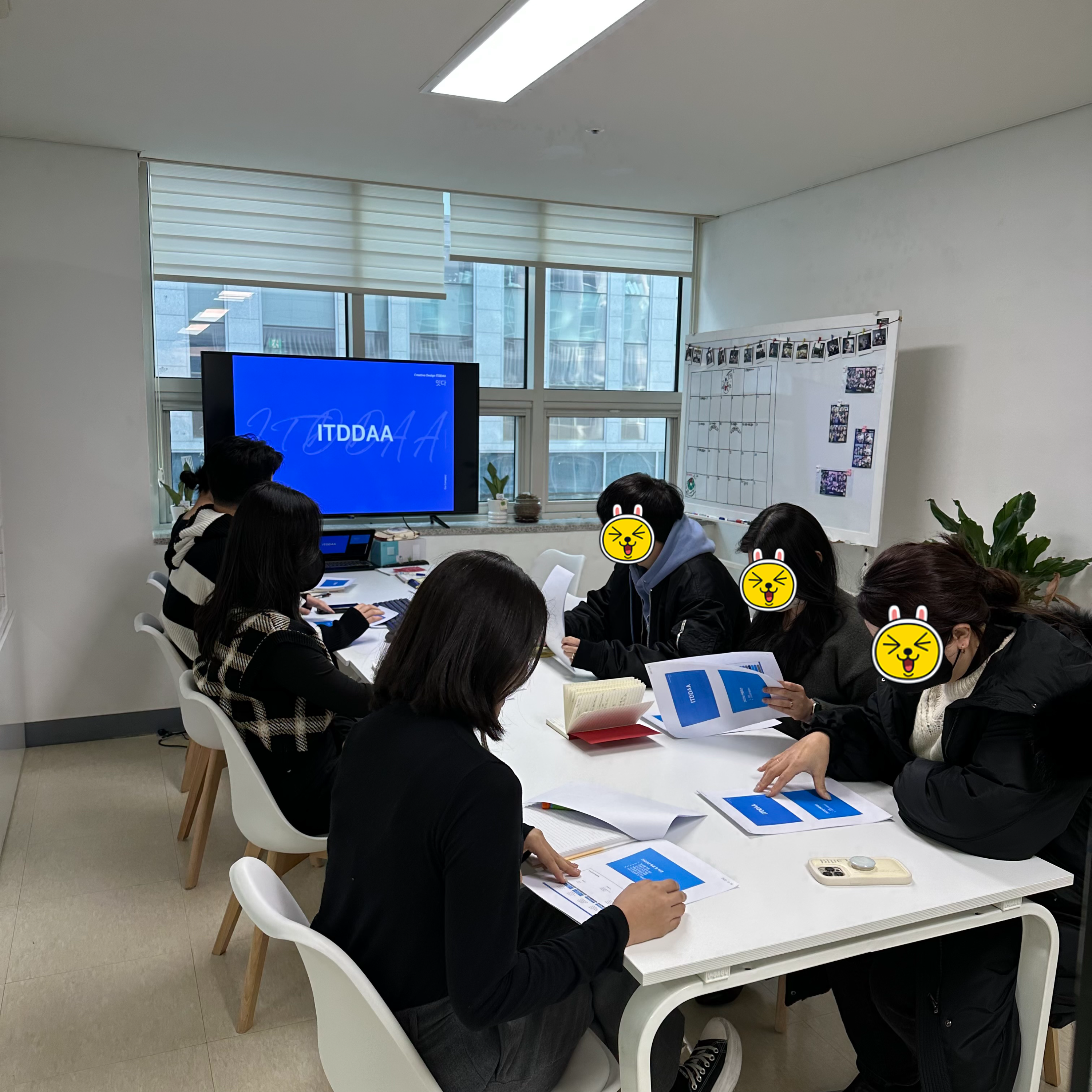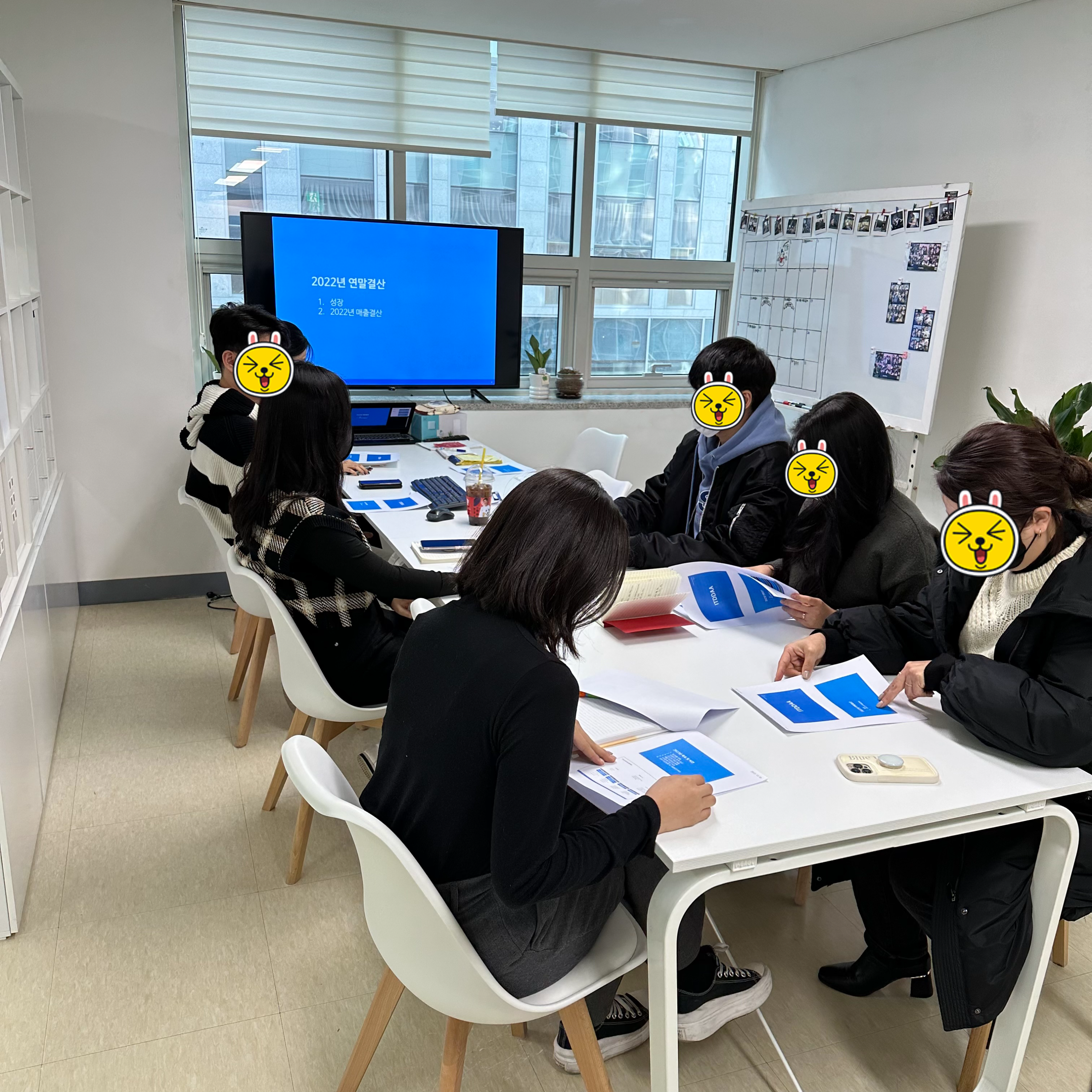 직원들과 회의실에 모여 앉아
