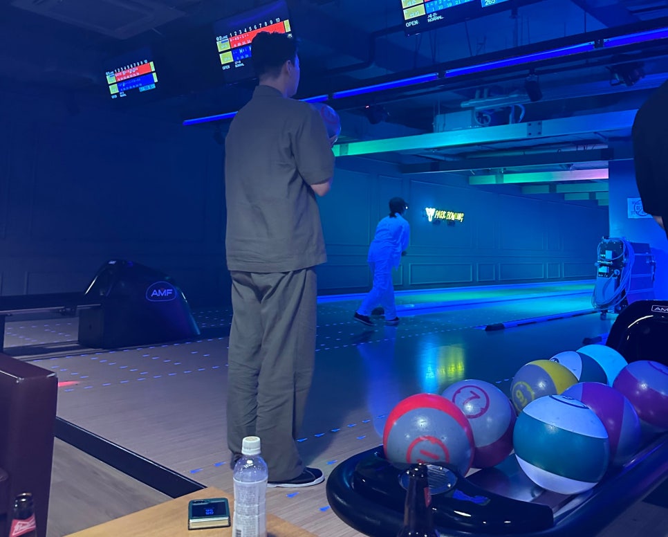 볼링장에 도착해서 저희는 볼링공과 각자 마실 음료와 과자 등 세팅해두고