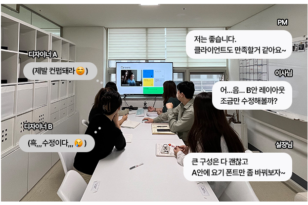 이 단계에서 컨펌받지 못하면 디자이너 분들은 다시 작업을 합니다 ㅠㅠ...